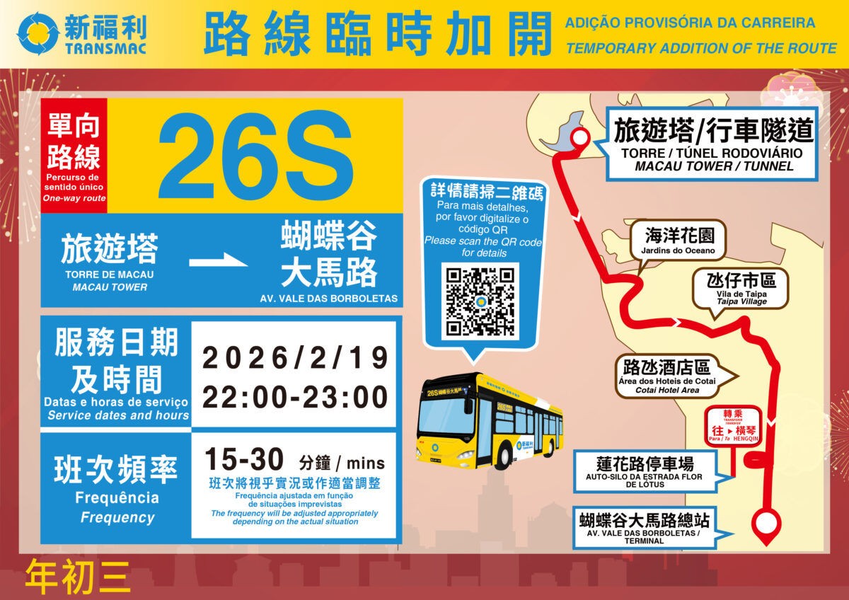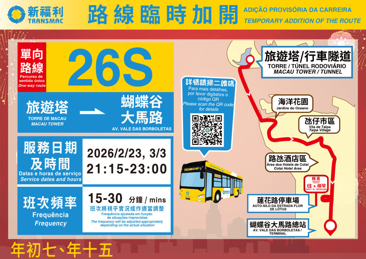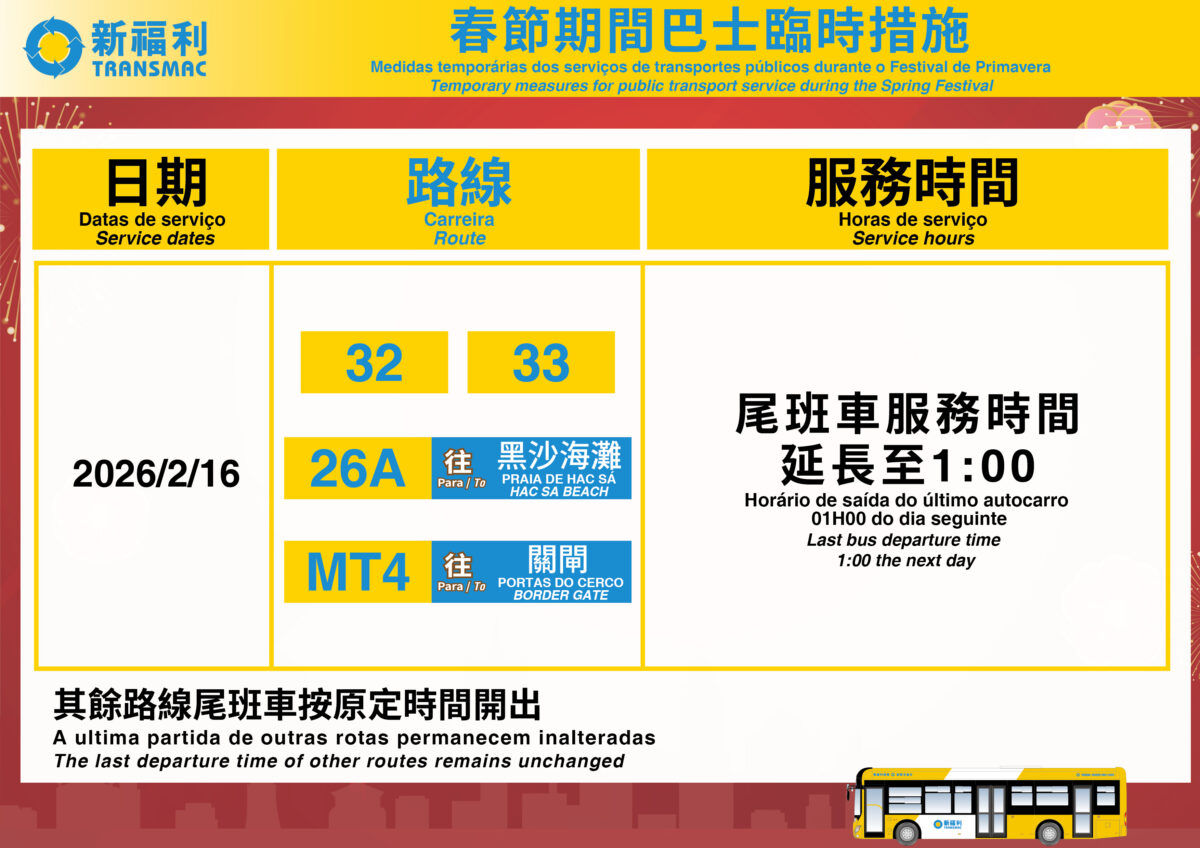 2024年正式投入服務的全新一批18m鉸接增程式超長大巴,目前為全澳甚至是全國首部鉸接增程式超長大巴,最高承載130人,環保效益和運輸效率兼具。配以三門、側跪功能,方便乘客上下車,配置防夾電動趟門,保護乘客安全;另配備左右電子後視鏡,提升巴士安全與服務。車廂內設有3塊動態顯示屏,方便乘客掌握路線行程。